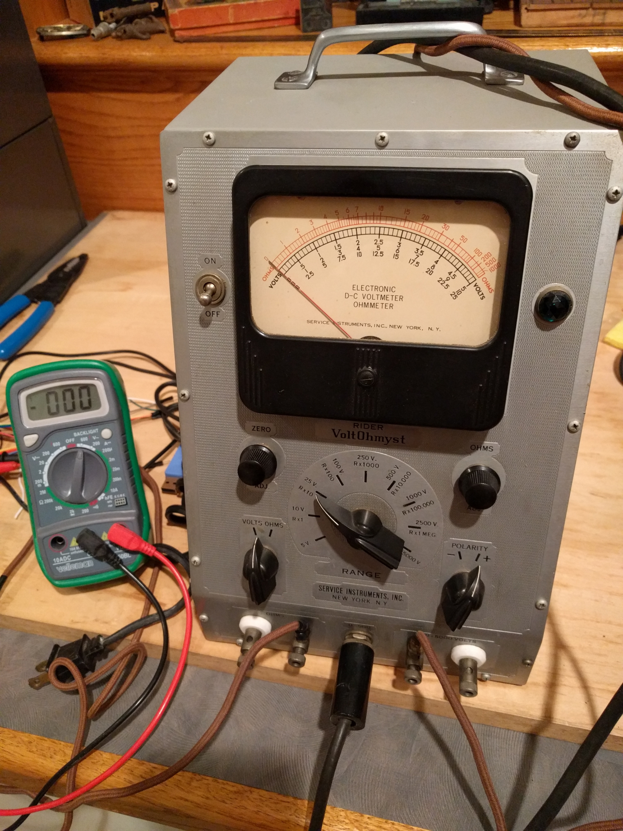 Could not help myself...Just had to bring home the Rider VoltOhmyst. Plugged her in and measured some voltage on some DC batteries as well as some ohms across some resistors. resistors. Dead on...Well after some adjustments and warming up. Will put on the shelf now.