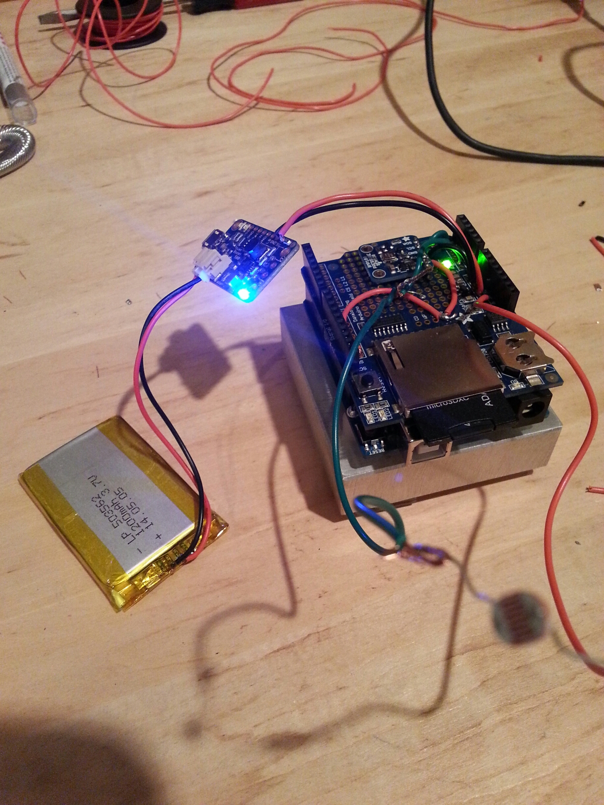 One lithium ion polymer battery and an Adafruit PowerBoost 500 Charger later I was able to get the project untethered from a power source.
