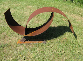 Fun abstract piece out of a couple of 2x3.5 foot steel arcs. Placed on a minimal stand for a very "floaty" look.
