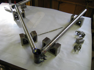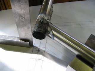 With the bottom bracket / seat tube down I can pull the down tube length from the drawing. Carefully aligning the frame over the drawing with the help of a machinist square and v-blocks I can now scribe the lines where the down tube intersects the bottom bracket. Also note, only the lug is only attached to the head tube at this point.