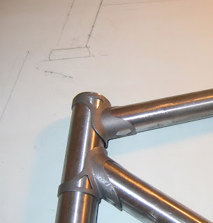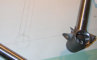 With the frame aligned about the drawing I can scribe the lines where the bottom bracket and down tube intersect. Notch out the lines and the down tube length is done.