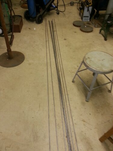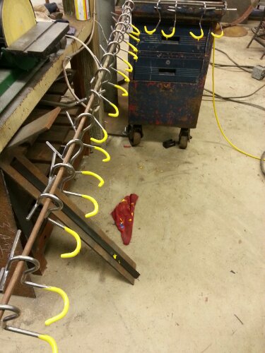 More hooks to make but rack is all in place. The rack is for service and inventory..not for display. Boxes are lined up where the second level of bikes will hang.