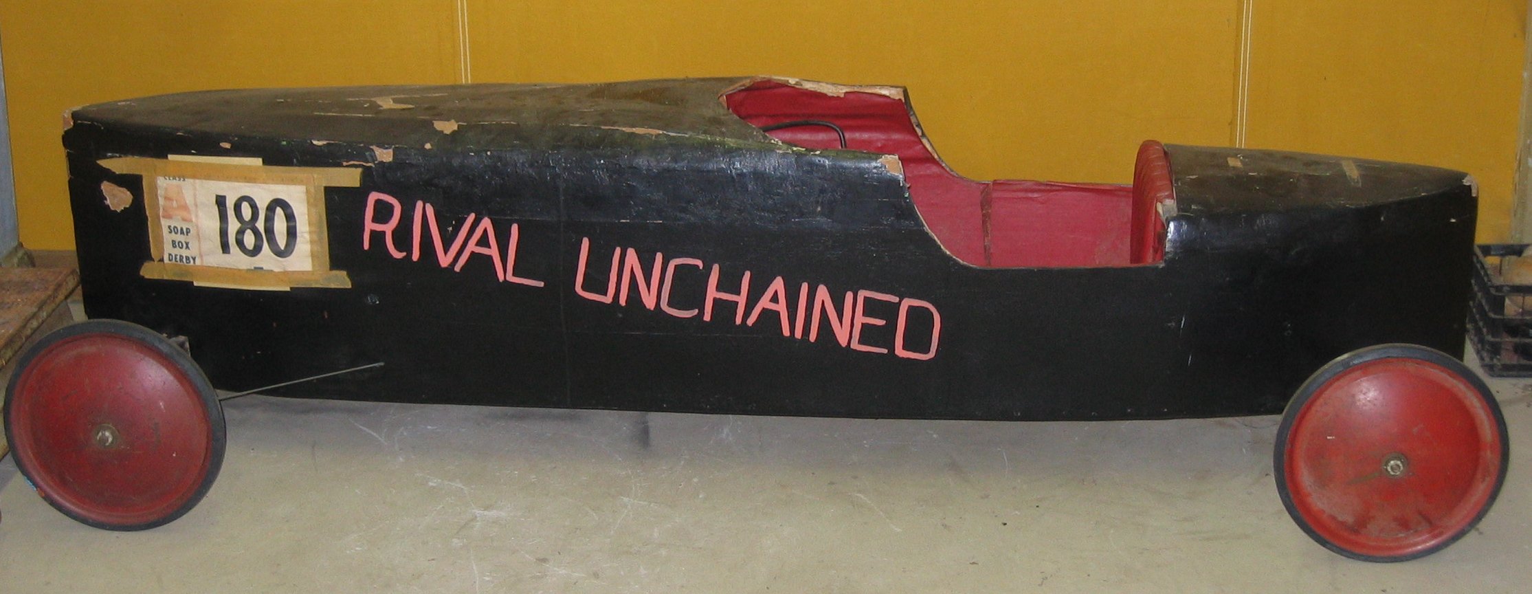 I have had this piece for a while but finally got around to taking some pics of it. It is a great early soapbox derby racer. Shows some age but is a great looking peace. Almost folk art in look. "Rival Unchained" !!! Great name.