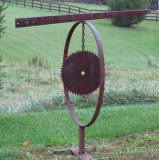 "Farmer" stands just over 6 feet high. Made from leaf springs, cultivator parts, railroad spikes and of course a tractor seat.